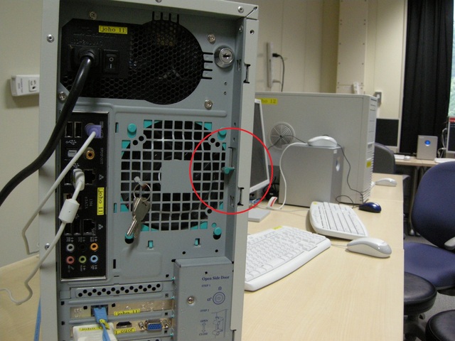赤丸で囲った部分にあるレバーを上にあげ,サイドパネルを手前にひいて外してください.