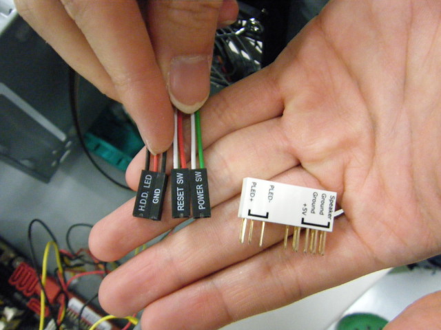 ケース前部から出ているPCケースのスイッチやLEDをM/Bにつなぐ端子群とそれを手助けするコネクター.