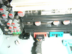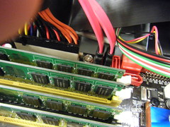 取り付けたDVDドライブとHDDをM/Bにつなぎます.これはIDEケーブルといいます.凹凸で差し込む向きが決まっているので注意. |