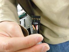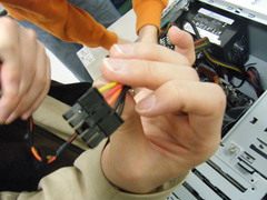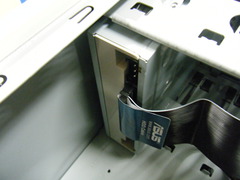 DVDドライブ, HDDと電源をつなぎます. ケーブルがたくさんあるので種類に注意. これはHDDとつなぐためのもの.細長いL字の口が特徴的. このL字口はHDD側に取り付けます |