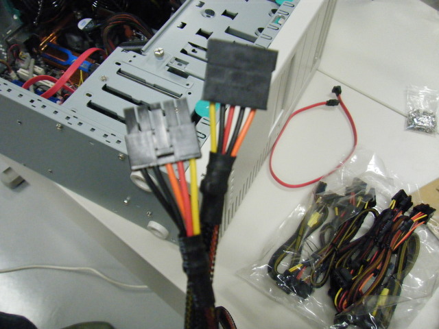 DVDドライブ, HDDと電源をつなぎます. ケーブルがたくさんあるので種類に注意. これはHDDとつなぐためのもの.細長いL字の口が特徴的. このL字口はHDD側に取り付けます.
