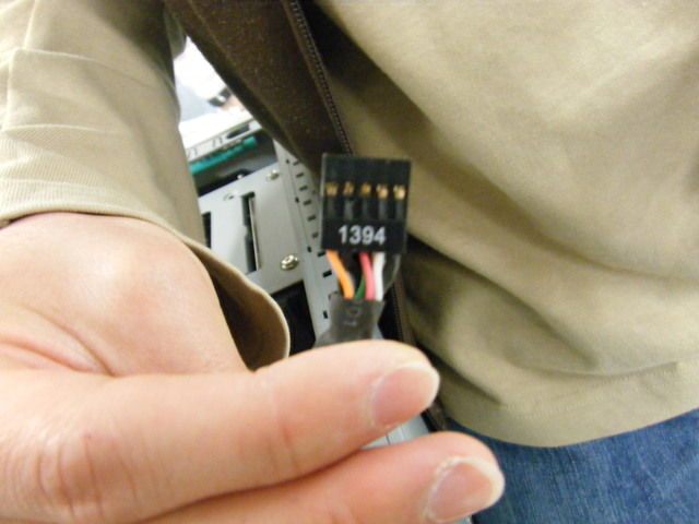 取り付けたDVDドライブとHDDをM/Bにつなぎます.これはIDEケーブルといいます.凹凸で差し込む向きが決まっているので注意.